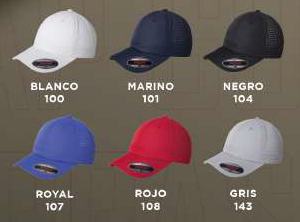 Gorra unitalla 100% poliester, 6 gajos, botón forrado, casco alto, banda absorbente, ojillos bordados, gajos laterales con microperforado laser y ajuste en velcro especial High tech con hebilla en forma de "0" sencilla.