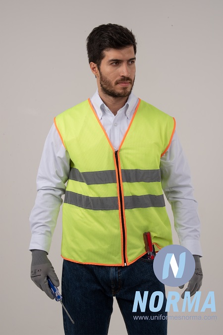 Confeccionado con dos bolsas en parte baja en la parte interna del chaleco, cierre nylon de alto rendimiento, viez contrastado en naranja neón, Reflejante en plata de 2” costurado con refuerzos para que no se desprenda tan fácil.