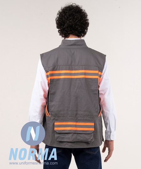 En la parte baja 2 bolsas tipo cargo con cierres; todas ellas reforzadas con remaches para una mayor durabilidad. Cierre nylon de alto rendimiento, viez contrastado en negro. Reflejante en naranja-plata de 2” costurado con refuerzos para que no se desprenda tan fácil. En la parte trasera se coloca una bolsa amplia con cierre lateral, de acceso rápido para colocar documentos o bebidas.
