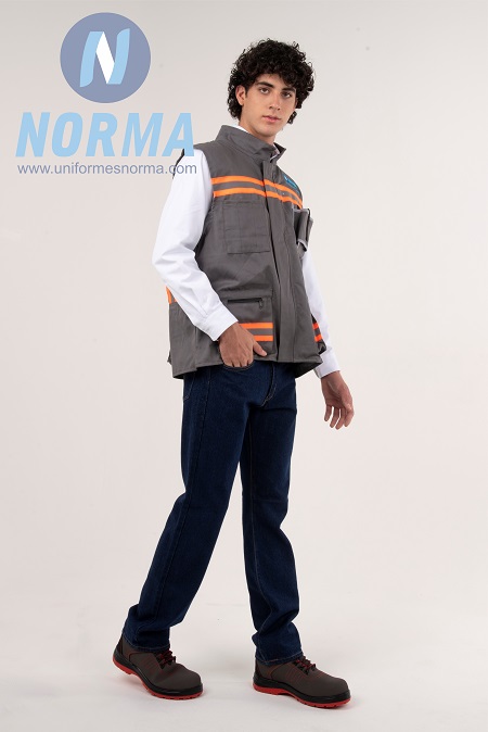 Chaleco tela tergal 4 bolsas y una atrás. La tela de este chaleco es de tergal suavizado en composición 100% poliéster; lo cual lo hace tener una apariencia muy elegante, es muy resistente al desgarre u objetos punzo cortantes. Amplia variedad de colores muy resistentes al descoloramiento. Confeccionado con dos bolsas en parte alta: lado derecho tipo cargo con cierre y lado izquierdo una con porta radio (puede cambiarse por bolsa tipo cargo).