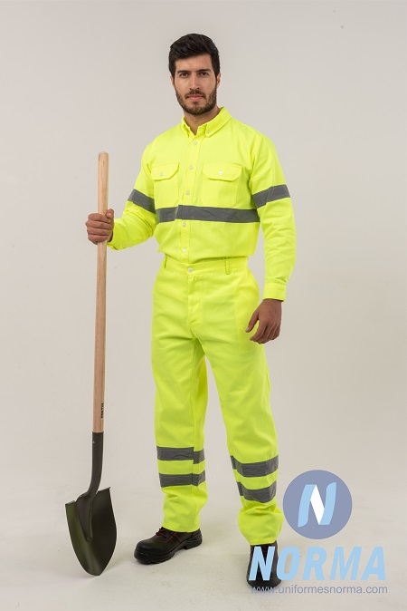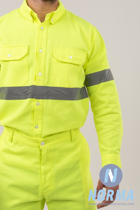Camisa y Pantalón amarillo neón con reflejantes. Uniforme de gabardina composición 65% poliéster 35% algodón color amarillo neón personalizado con reflejantes en 2” color plata de alta visibilidad y reflectividad. La camisa se puede fabricar en manga corta o manga larga. Pantalón confeccionado en la misma tela que la camisa, con dos bolsas al frente en diagonal y dos bolsas atrás.