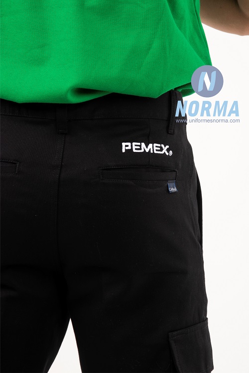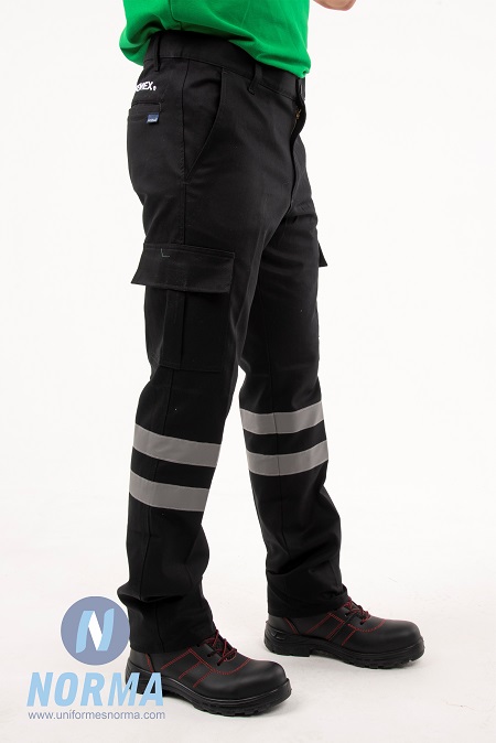 Color negro tipo cargo. Pantalón de trabajo con dos franjas reflejantes de 2” debajo de las rodillas en cada pierna. Cierre latón reforzado y costuras reforzadas con remaches en zonas de alta fricción o desgaste. Composición: 100% algodón Kaltex®.