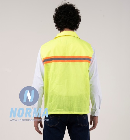 Confeccionado con tres bolsas: una en parte alta tipo parche y dos en parte baja con bolsas tipo cargo con cierre reforzadas con remaches para una mayor durabilidad (puede confeccionarse con tapa en lugar de cierre), cierre nylon de alto rendimiento. Reflejante en naranja- plata de 2” costurado con refuerzos para que no se desprenda tan fácil.