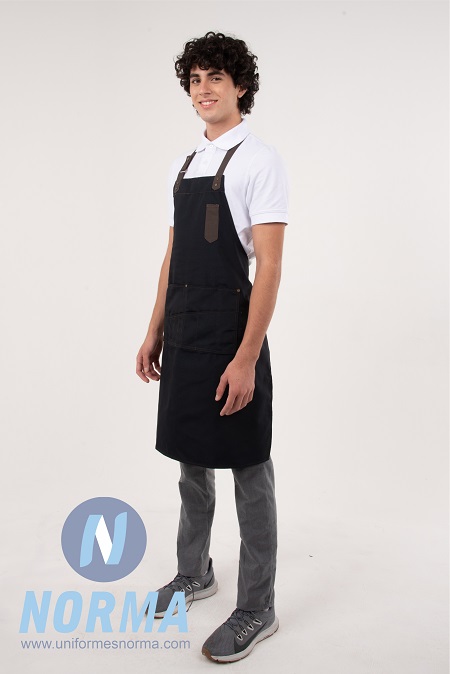 Una identidad muy fresca y única da este mandil con pechera. Confeccionado en loneta ligera 100% algodón que da protección evitando las manchas y salpicaduras. Remaches en hilo y metálicos. Tiene correa para ajuste al cuello y en cintura en material de tela café. Ajuste en cuello con broche de presión. Dos bolsas en parte frontal inferior dividida en dos, para comanda y plumas. Y una en parte superior para pluma. Colores disponibles Negro con contraste café.