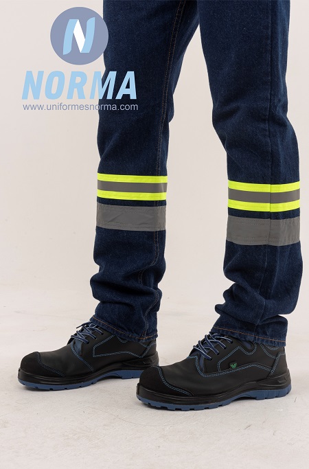 Pantalón de trabajo con cintas reflejantes plata de 2”. Esta confeccionado en una tela de 14 onzas 100% algodón. Con corte recto en piernas, lo cual permite tener mayor comodidad en el trabajo. Cierre metálico de larga duración. Remaches en hilo en presillas y en sus dos bolsas traseras y metálicos en bolsas delanteras.