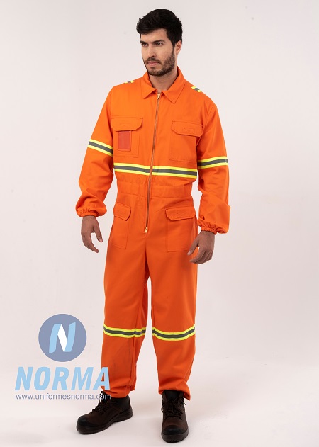Remaches en hilo en zonas de alto desgaste para una mayor durabilidad. Incluye cinta reflejante en color plata de alta visibilidad en 1” ½” en brazos y piernas.