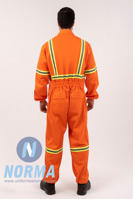 Remaches en hilo en zonas de alto desgaste para una mayor durabilidad. Incluye cinta reflejante en color plata de alta visibilidad en 1” ½” en brazos y piernas.