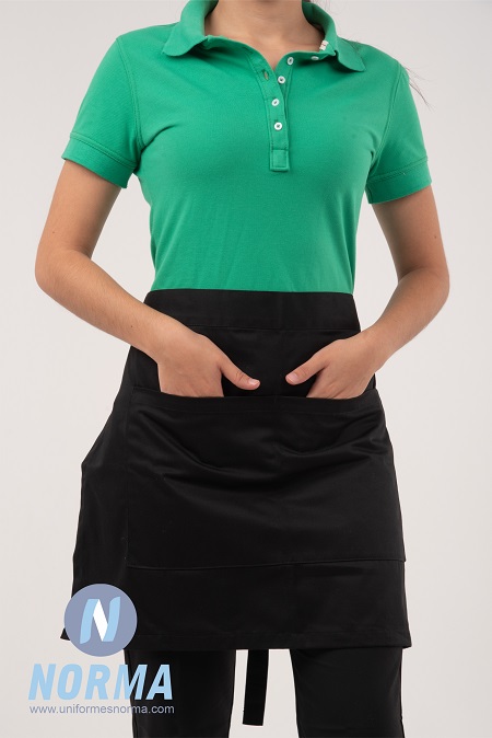 Medio mandil para mesero. Muy cómodo, fresco y práctico por sus múltiples bolsas con fácil acceso. Confeccionado en gabardina con ajuste en cintura mediante dos correas reforzadas. Trea tres bolsas para colocar plumas, libreta, ordenes etc y una oreja para portar jerga limpiadora.