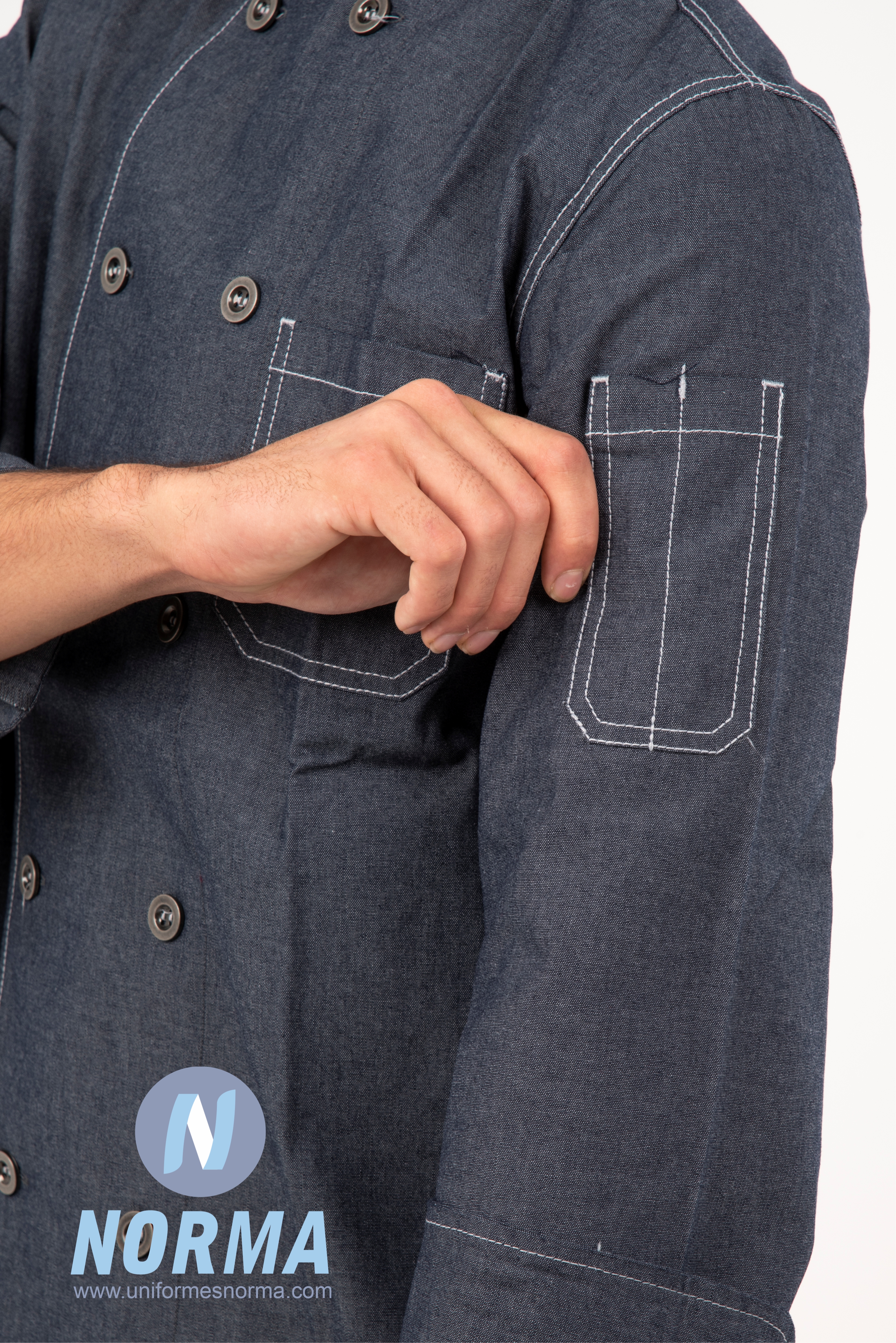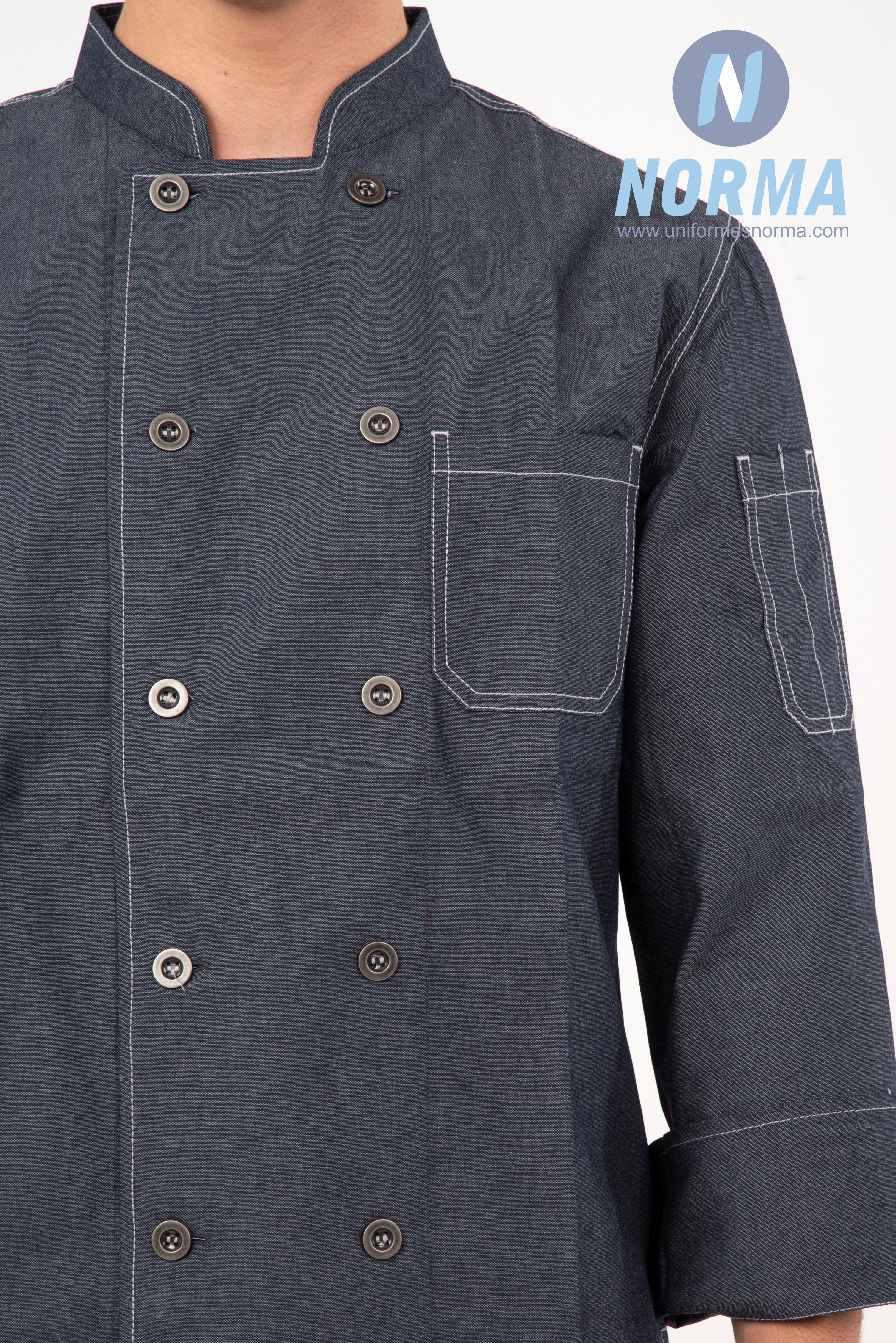 Filipina para chef en mezclilla con botones metálicos de cuatro agujeros. Incomparable diseño y calidad. ¡Sus detalles y funcionalidad harán que resaltes en tu cocina!. Manga larga con puños reversibles. Doble botonadura con botón metálico de cuatro orificios. Doble costura en contraste en toda la prenda. Bolsillo en parche al frente izquierdo y bolsillo para termómetro en manga. Tela mezclilla: 65% poliéster, 35% algodón; 200 g/mt2.
