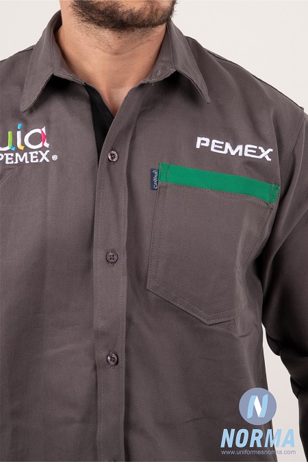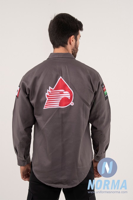 Color gris obscuro unisex. Camisa de trabajo con detalles internos en aletilla de tela color negra donde se abotona la camisa y franja color verde (Pantone 7482 C) en el bolsillo izquierdo, remaches a los costados para una mayor sujeción. Composición: 100% algodón Kaltex®. Color: Gris, vivos negros y verde. Doble costura en zona de alto desgaste. Logotipos: 2 bordados directos y 3 bordados tipo parche.