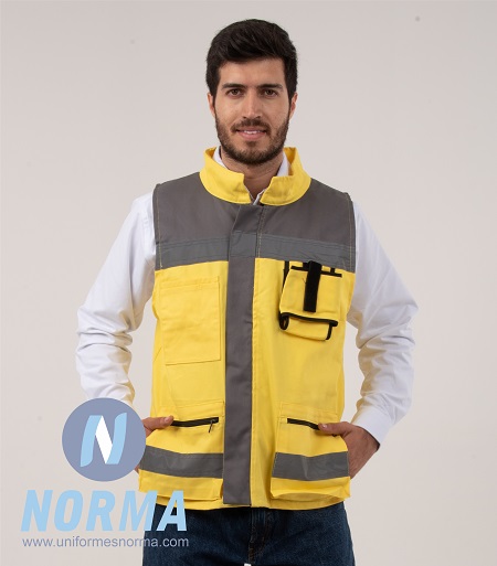 Chaleco tela gabardina 4 bolsas y malla atrás. La tela de este chaleco es de gabardina en composición 65% algodón y 35% poliéster; lo cual lo hace muy fresco y resistente al desgarre u objetos punzo cortantes. Amplia variedad de colores resistentes al descoloramiento. Confeccionado con dos bolsas en parte alta: lado derecho tipo parche con portaplumas y lado izquierdo un porta radio (puede cambiarse por bolsa tipo cargo).