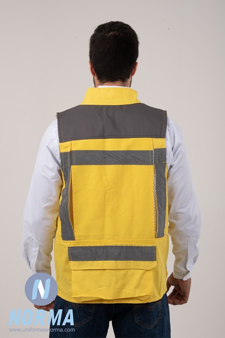 En la parte baja 2 bolsas tipo cargo con cierres; todas ellas reforzadas con remaches para una mayor durabilidad. Cierre nylon de alto rendimiento, viez contrastado en negro. Reflejante en amarillo-plata de 2” costurado con refuerzos para que no se desprenda tan fácil. En la parte trasera se coloca una malla para tener mayor transpirabilidad y frescura.