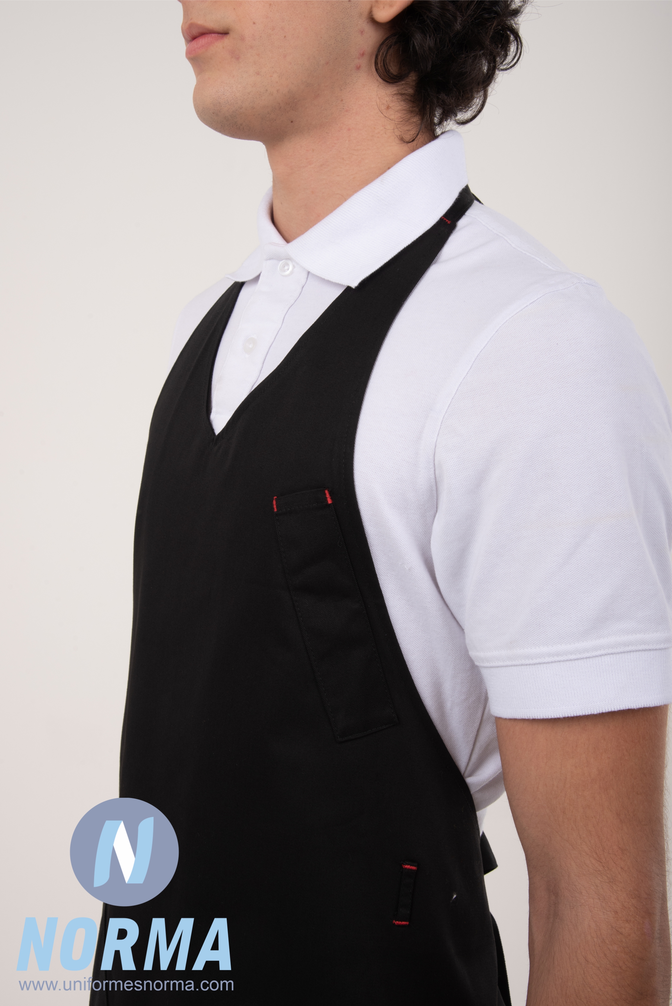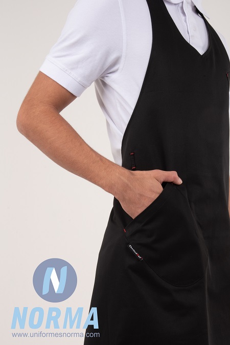 Mandil de peto de altura ajustable con cuello V. Tela gabardina 65% poliéster 35% algodón. Te brindara un estilo único con su elegante diseño, fina tela y contraste en los remaches de hilo para dar un toque diferente. Se ajusta al cuello con tirante de corredera, bolsa inferior al lado derecho y frente izquierdo para pluma. Presillas para usar las cintas amarradas al frente. Colores disponibles: rojo, negro y café.