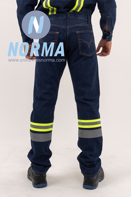 Pantalón de trabajo con cintas reflejantes plata de 2”. Esta confeccionado en una tela de 14 onzas 100% algodón. Con corte recto en piernas, lo cual permite tener mayor comodidad en el trabajo. Cierre metálico de larga duración. Remaches en hilo en presillas y en sus dos bolsas traseras y metálicos en bolsas delanteras.
